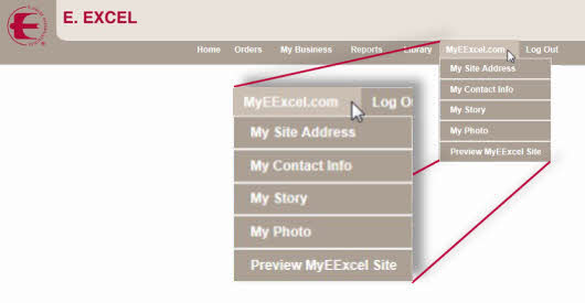 Setting up your website in the Business Center is simple. Place the cursor over MyEExcel.com in the top menu bar. When you do, a drop-down list appears. Click each of these items in turn, and complete the resulting screens.